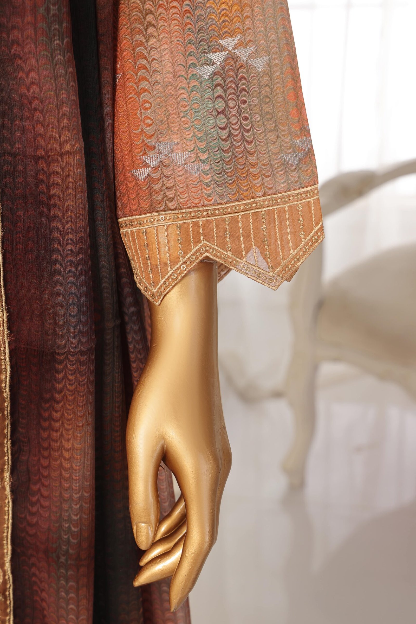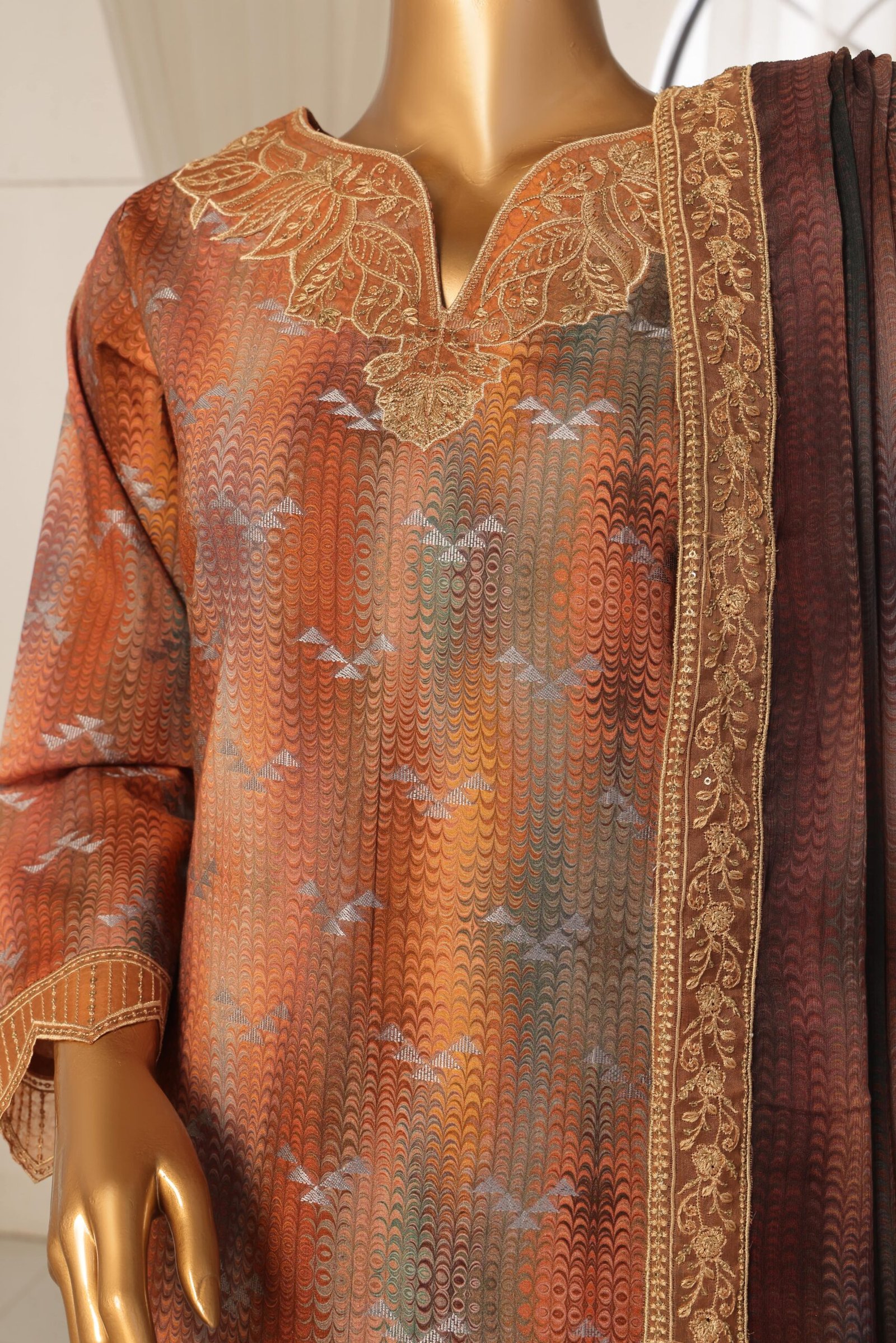 Design details: Rust brown embroidered three pc featuring a printed jacquard lawn shirt with a V-slit neckline adorned with golden thread embroidery and floral motifs. The shirt showcases a geometric wave pattern throughout, finished with embroidered sleeves and an intricately detailed cutwork hem. Paired with dyed cambric trousers accented with a contrast green band and lace edging, and a printed chiffon dupatta in rich rust and mahogany tones with embroidered borders.